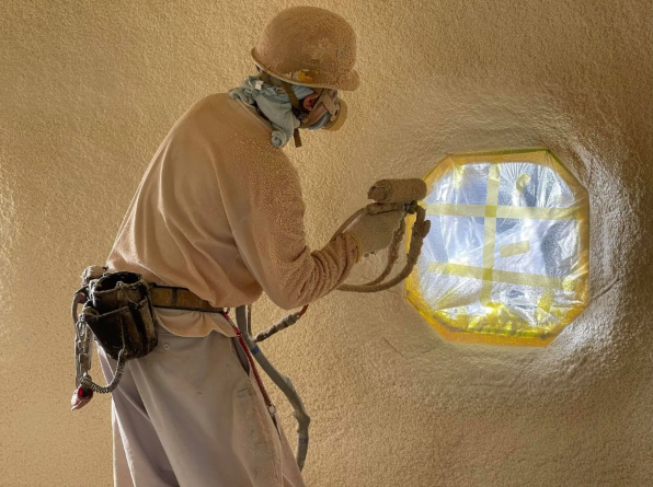 空気で膨らませたテント生地に硬質ポリウレタン断熱材を吹付け、形を形成。