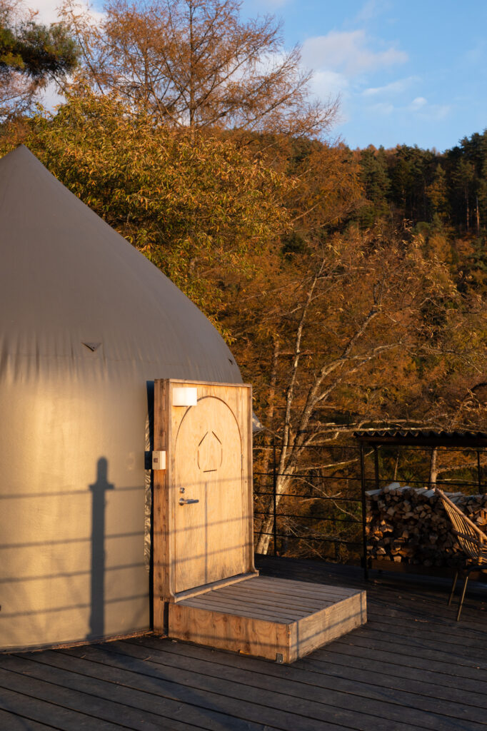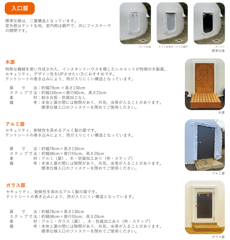 | 木製扉 | 国産ヒノキ・スギ材などを使用した木製パネル構造 | ・温かみのある外観でデザイン性が高い ・断熱性があり冬季でも快適 ・表面に防腐・防水処理を施している | ・ファスナー+鍵併用で安全性を向上 | ・木扉は木材保護塗料の塗布により耐候性強化可能、扉のみの交換対応可 | グランピング施設・宿泊施設・展示ブース | ・雨天時も雨水が入りにくい“巻き込み構造”を採用 |