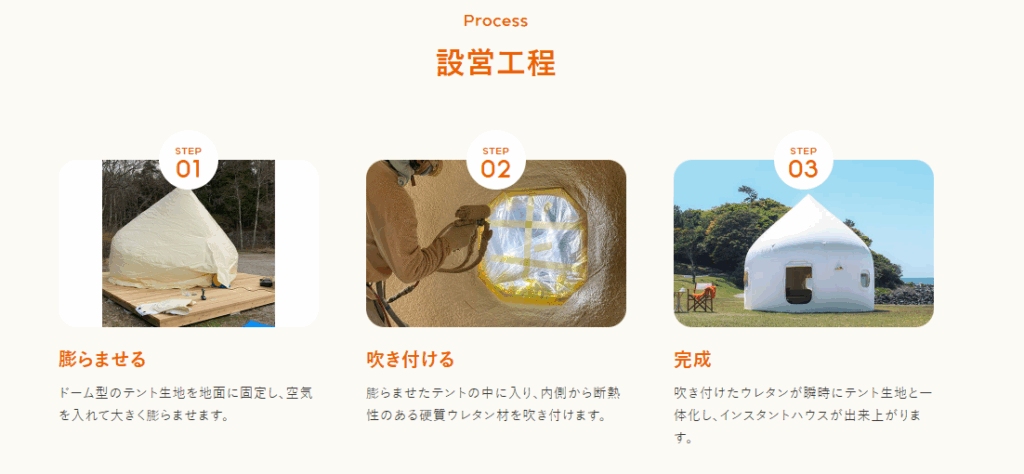 インスタントハウスの最大の特徴は、空気を使って膨らませる施工方式です。テント生地を固定し、内部から空気でドームを膨張させると、球状のフレームが自立します。その後、内側から硬質ウレタンを吹き付けて固定化。これにより、わずか数時間で強固な断熱ドームが完成します。構造体そのものが壁・断熱材・防水層を兼ねるため、無駄のない軽量建築が可能です。