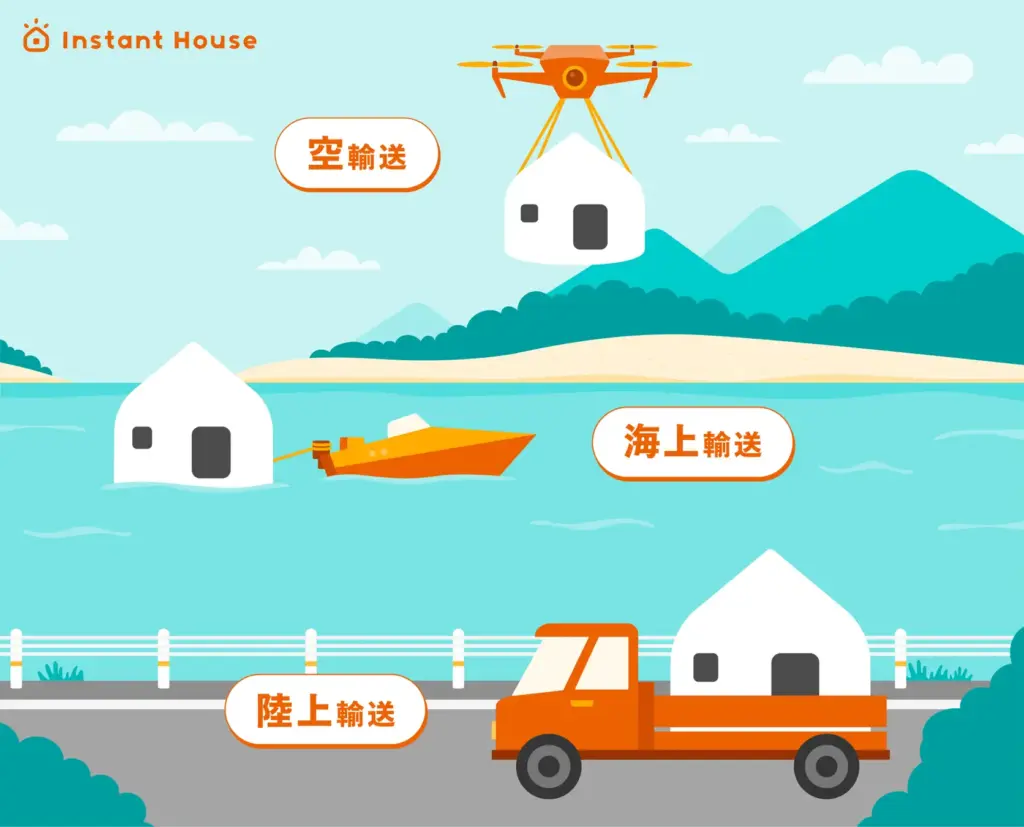 近年、山間部や離島、水辺エリアなどトラックが入れない場所での設営には、ドローン搬送や海上輸送が注目されています。インスタントハウスの強くて軽いという特徴を活かして、部材ではなく完成した居住空間をそのまま空中輸送・海上輸送する実証実験を行い、輸送・設置に成功しています。山間部や離島エリアの建築の課題を解決することで、魅力的な地域資源の活用を促し、宿泊業や新規事業などの参入増加による地域の賑わいづくりや関係人口増加に貢献しています。また、災害発生時にも、土砂崩れ等で孤立した集落などの陸上輸送が困難な場所に、短時間で居住空間を提供することが可能です。インスタントハウスは全国各地の必要とされるあらゆる場所で、防災や被災地支援、地域の賑わいづくりなど多様なニーズに応え人々に寄り添う空間を提供しています。