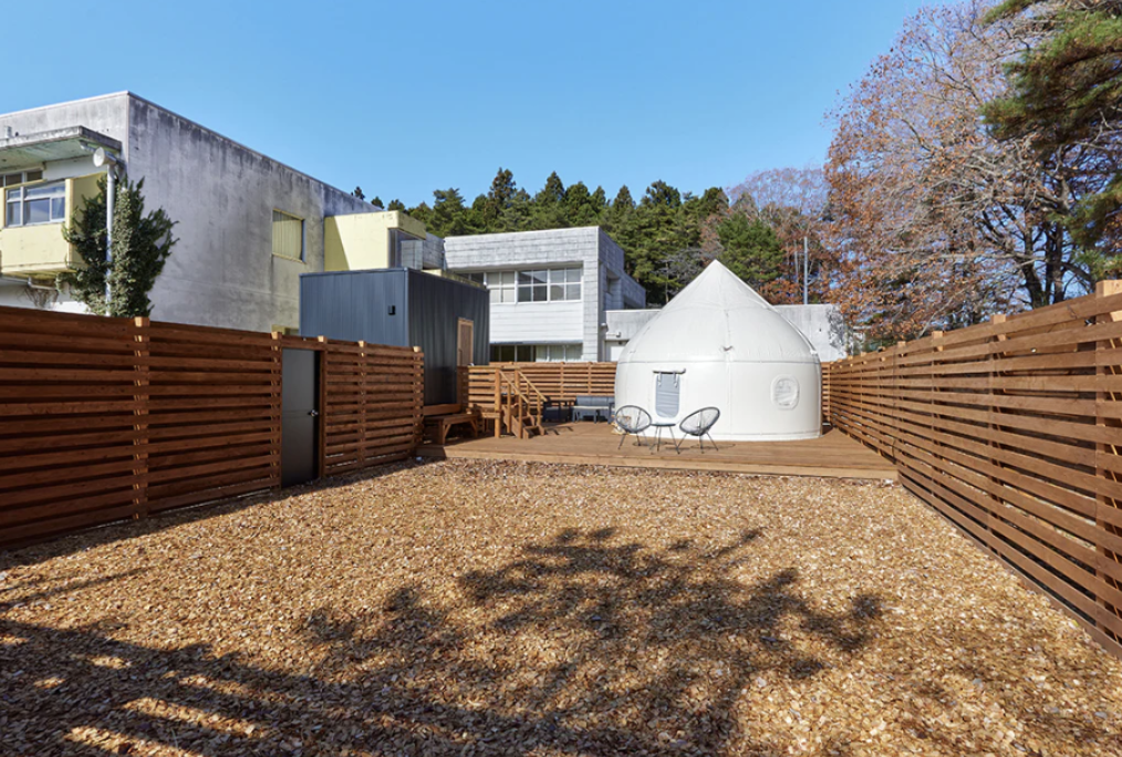 栃木県那須市のグランピング施設では、インスタントハウスにウッドデッキで連結された外部シャワールームを組み合わせ、宿泊者が快適に過ごせる環境を実現しました。水回り棟にはペット用シャワーもついており、ドッグランで走り回って遊んだあとも綺麗な状態でお部屋で過ごすことができます。