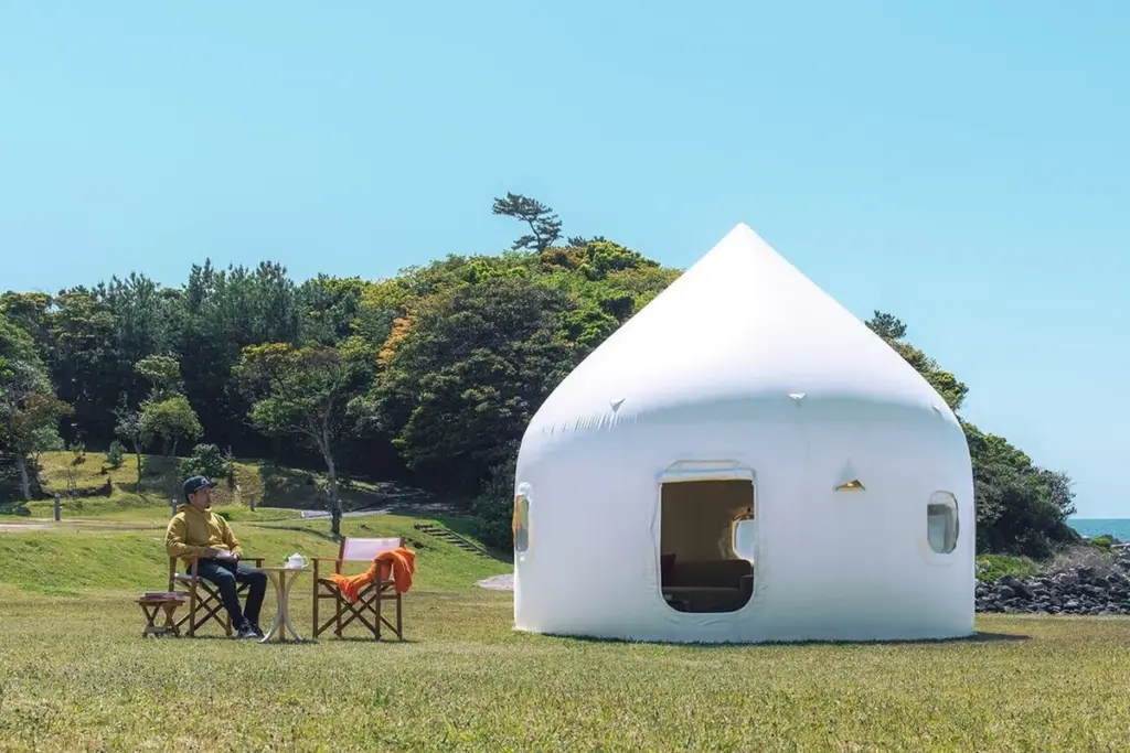 インスタントハウスの標準仕様は、国産の防炎テント生地を使用し、火災リスクを低減しています。外壁にはフッ素系防汚処理が施され、紫外線を遮断するUVカット機能も標準搭載。外気温の影響を受けにくく、夏は屋外より−20℃、冬は+20℃の快適な室温を維持します。断熱性と重力換気により、カビや結露の発生を抑え、常に清潔な空間を保てます。固定資産税が不要なため、長期運用のコストパフォーマンスにも優れています。